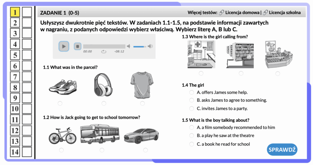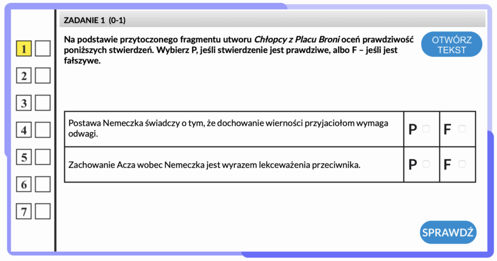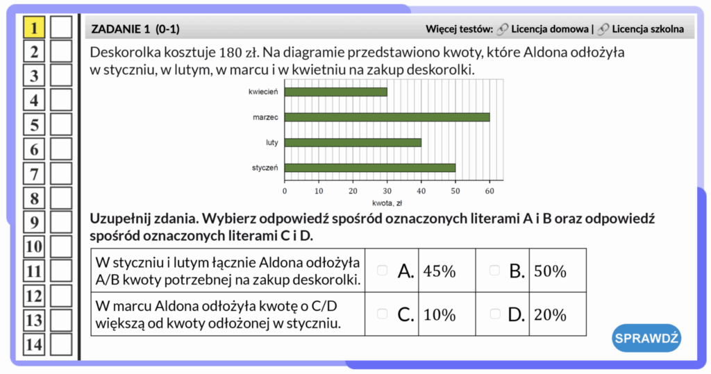 Przygotowaliśmy dla ósmoklasistów prawdziwy egzamin ósmoklasisty z 2025 roku, zamieniony na wygodną, interaktywną wersję opracowaną przez EduProgramy. Wariant ćwiczeniowy umożliwia bieżący podgląd odpowiedzi, ich poprawianie oraz rozpoczęcie rozwiązywania w dowolnym miejscu testu – pełna elastyczność nauki i powtarzania materiału.